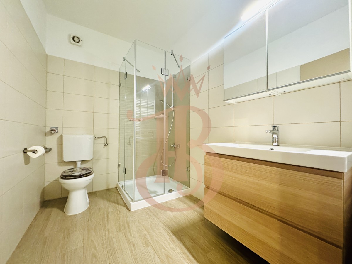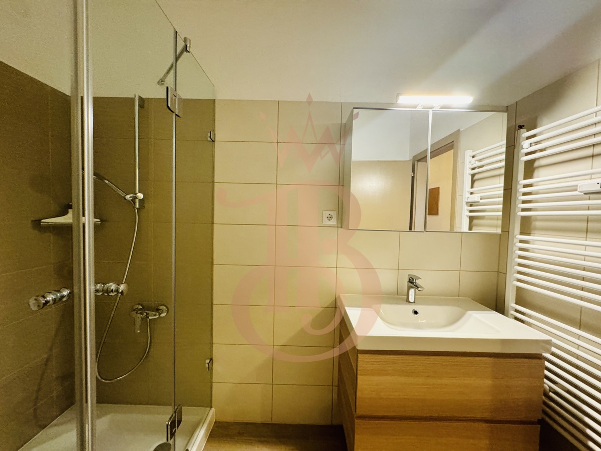 – Badezimmer: Modernes Bad mit Dusche und Waschmaschinenanschluss.