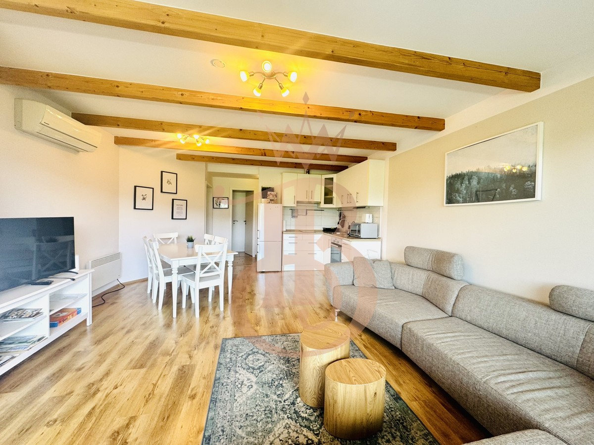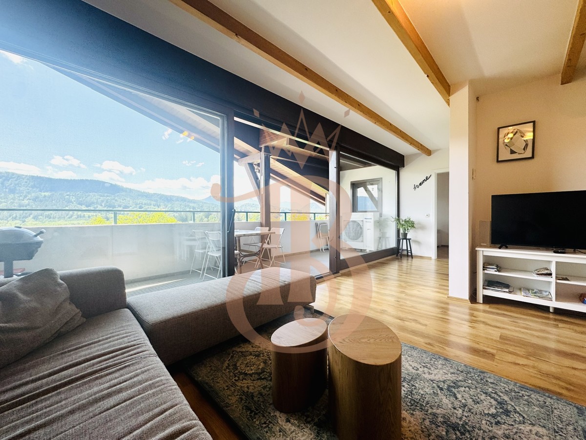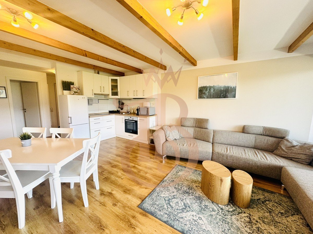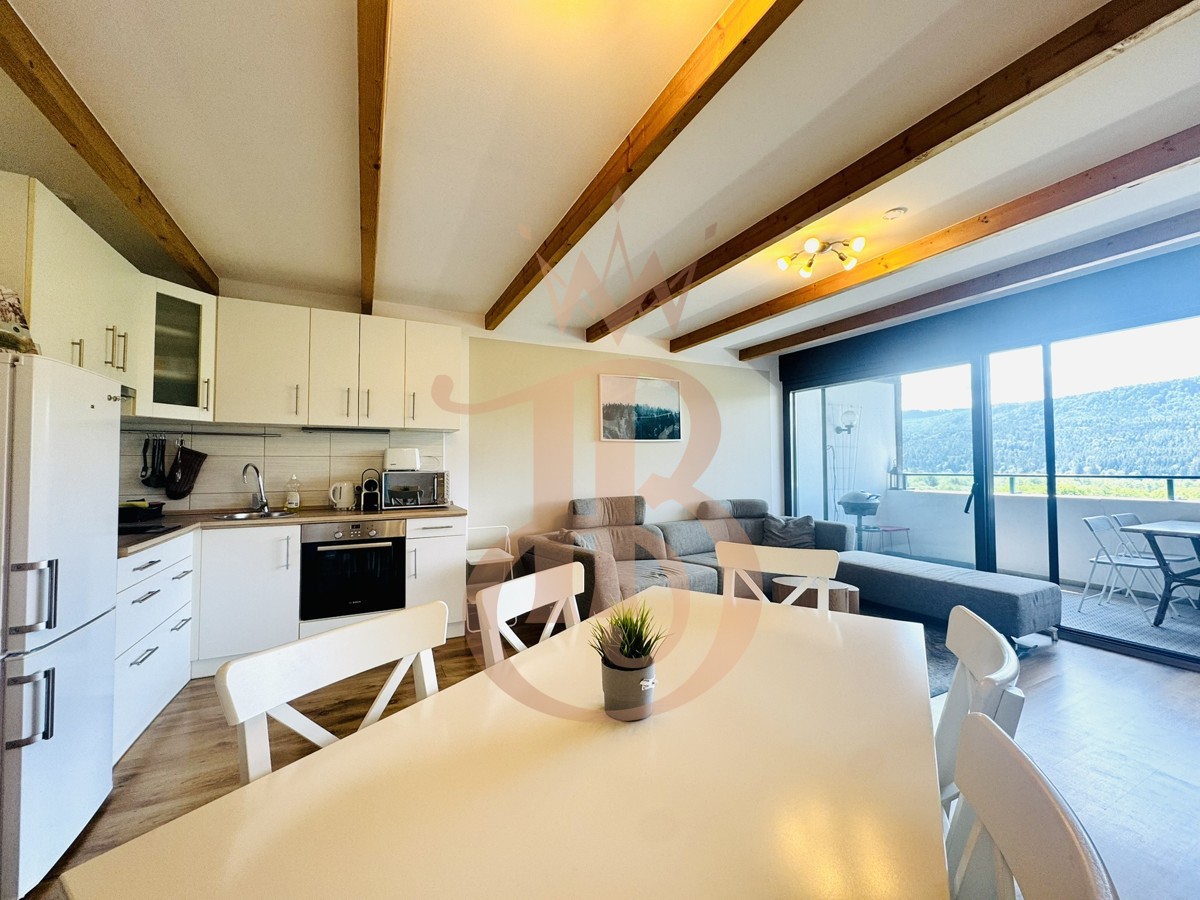 Das Herzstück der Wohnung ist der lichtdurchflutete Wohn-Essbereich mit moderner Einbauküche und Zugang zur großen, sonnigen Loggia – von hier aus genießen Sie einen atemberaubenden Fernblick über die Naturkulisse.