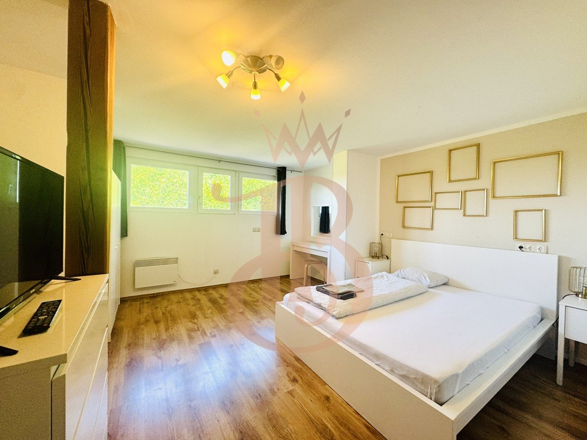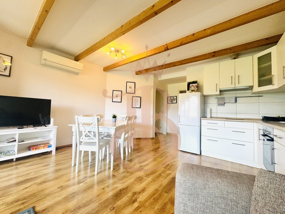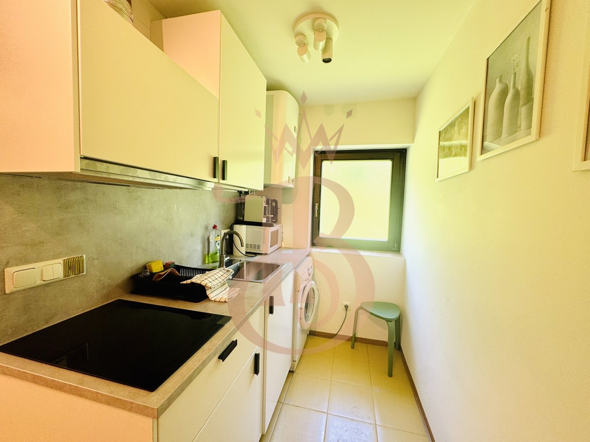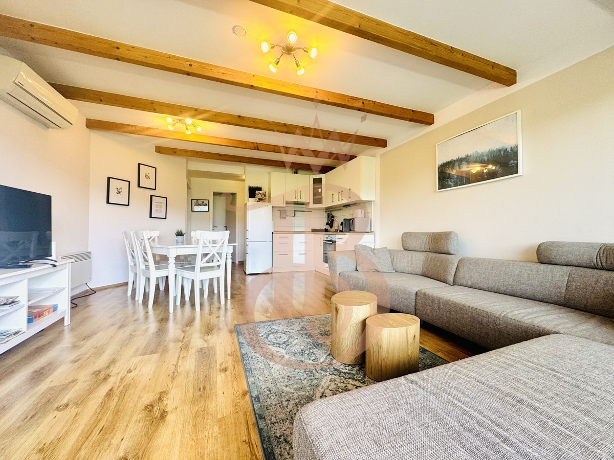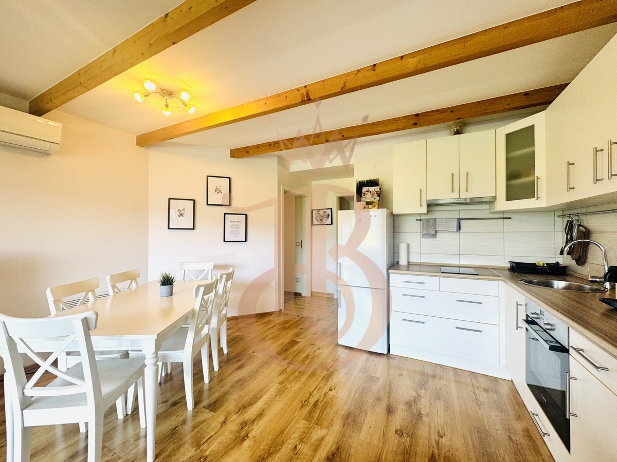 Das Herzstück der Wohnung ist der lichtdurchflutete Wohn-Essbereich mit moderner Einbauküche und Zugang zur großen, sonnigen Loggia – von hier aus genießen Sie einen atemberaubenden Fernblick über die Naturkulisse.